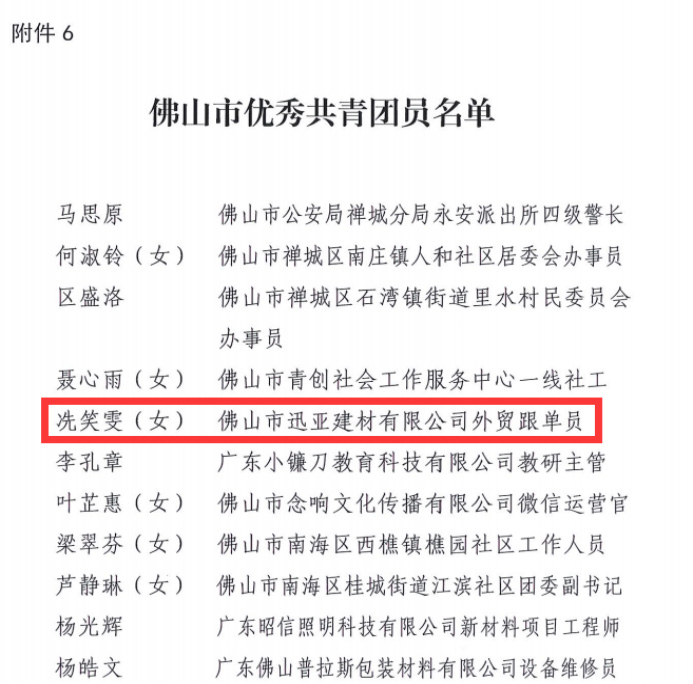 2021年5月8日,共青團佛山市委員會公布《關于表彰2020-2021年度佛山市五四紅旗團委(標兵)、五四紅旗團支部(標兵)、優秀共青團干部、優秀共青團員的決定》,佛山市迅亞建材有限公司團支部團員冼笑雯榮獲市“優秀共青團員”榮譽稱號。